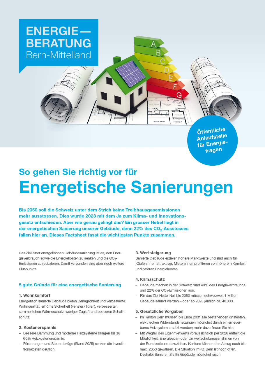 Die öffentliche Energieberatung Bern-Mittelland hilft Ihnen, Möglichkeiten zum Energiesparen zu erkennen und auszuschöpfen. Wir beantworten Fragen zu Themen wie: