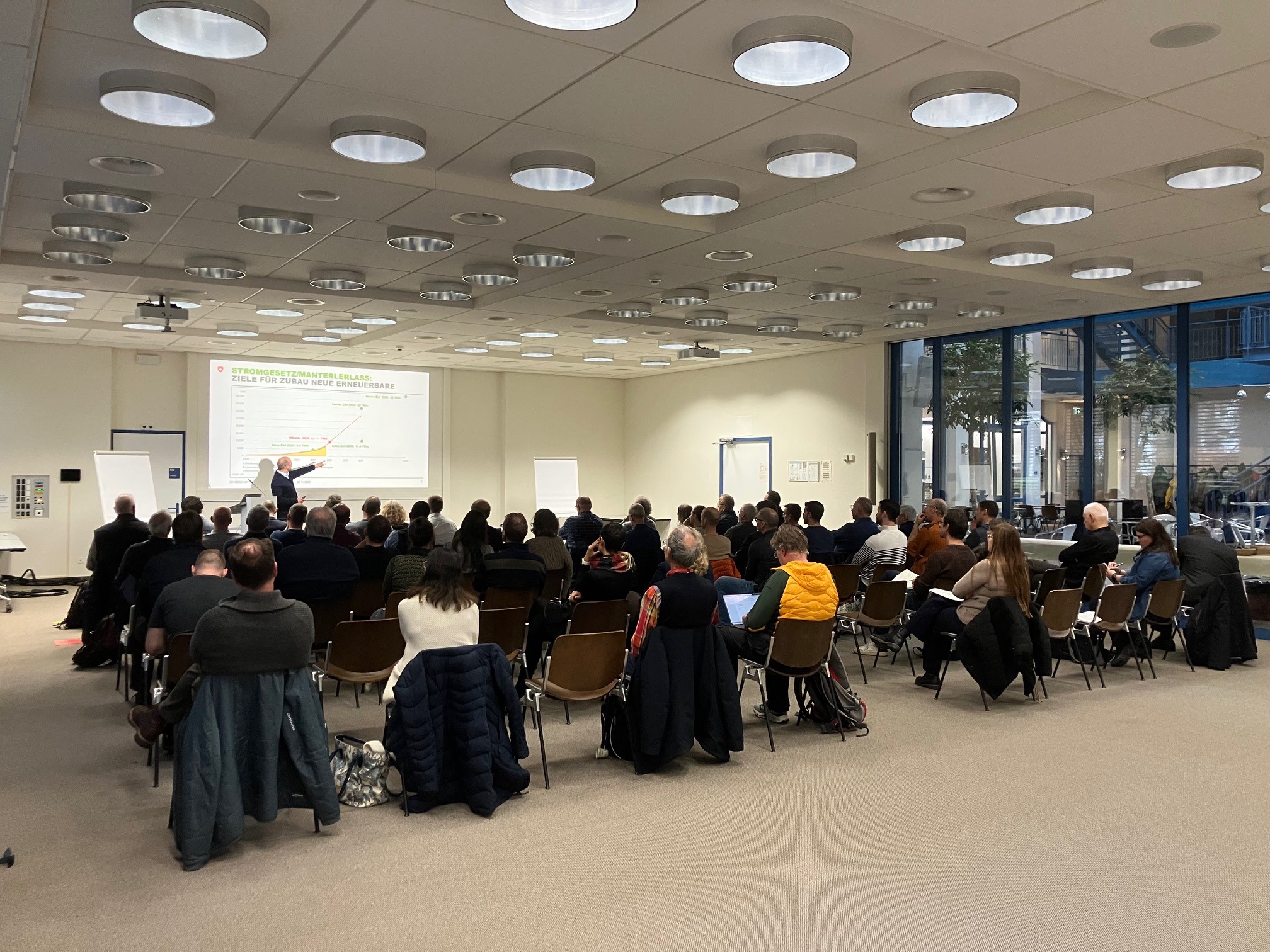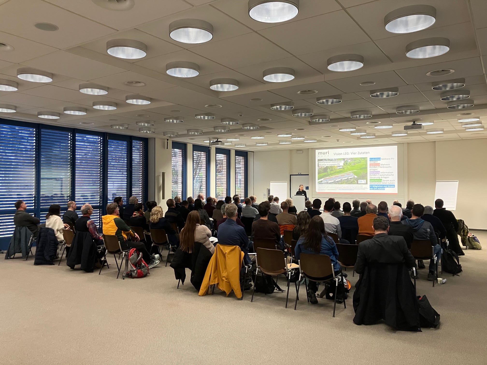 Am ERFA-Anlass der Energieberatungsstelle Bern-Mittelland wurden die Chancen, Stolpersteine und Möglichkeiten einer LEG anhand von zwei Machbarkeitsstudien vorgestellt und mit Expert:innen diskutiert. Ziel der Veranstaltung war es, den Gemeinden praxisnah aufzuzeigen, was beim Aufbau einer LEG zu beachten ist, welche Rolle die Gemeinde dabei übernehmen kann, und welche Aspekte die Wirtschaftlichkeit einer LEG beeinflussen. Zudem bot der Anlass eine Übersicht zu den verschiedenen Möglichkeiten, die heute gemäss Gesetz realisierbar sind. In der Podiumsdiskussion und beim anschliessenden Apéro konnten die 55 Teilnehmenden offene Fragen klären.
